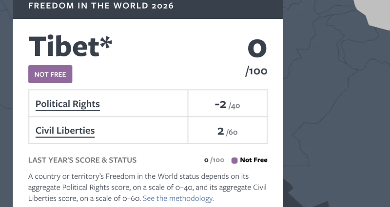 Tibet’s global freedom score is zero for the third year in a row, according to the Freedom in the World 2026 report released by the watchdog group Freedom House on 19 March, and Tibet remains “not free.”