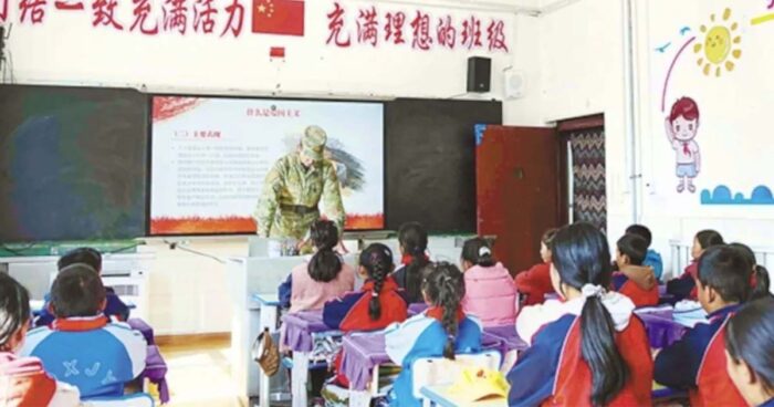 A current example of this is provided by a report from the Chinese propaganda media in the southern Tibetan county of Medog. The accompanying photo (see above) shows a uniformed army veteran “explaining weapon models” to elementary school students, as the report states.